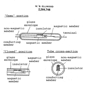 The reed switch is an electrical switch operated by an applied magnetic field. It was invented at Bell Telephone Laboratories in 1936 by W. B. Ellwood. It consists of a pair of contacts on ferrous metal reeds in a hermetically sealed glass envelope. The contacts may be normally open, closing when a magnetic field is present, or normally closed and opening when a magnetic field is applied. The switch may be actuated by a coil, making a reed relay,[1] or by bringing a magnet near to the switch. Once the magnet is pulled away from the switch, the reed switch will go back to its original position.