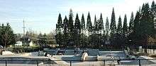 During the skatepark design process, the city received over 100 suggestions from residents, primarily from teenagers.[6] The process resulted in plans for a skatepark that featured primarily street elements such as steps and rails that skateboarders would normally find in urban settings.[6] Mike McIntyre and his SITE Design Group were hired by the city to design the skatepark, which had then grown to a 18,000-square-foot (1,700 m2) plan and a cost of $200,000 to $300,000.[6] The city put the construction out for bid on the entire park in May 2002, with estimates for the total cost of the park reaching as high as $1.5 million.[6][7]