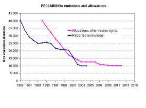 Emissions of NOx were reduced, albeit in the first many years more slowly than had been expected (see figure), and more slowly than under previous regulations. In its 2003 evaluation of RECLAIM, EPA concluded: