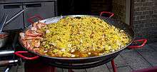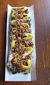Street foods, ready-to-eat food or drink sold in a street or other public place, such as a market or fair, by a hawker or vendor, often from a portable stall,[1] have variations within both regions and cultures.[2] For example, Dorling Kindersley describes the street food of Viet Nam as being "fresh and lighter than many of the cuisines in the area" and "draw[ing] heavily on herbs, chile peppers and lime," while street food of Thailand is "fiery" and "pungent with shrimp paste... and fish sauce" with New York City's signature street food being the hot dog, although the offerings in New York also range from "spicy Middle Eastern falafel or Jamaican jerk chicken to Belgian waffles."[3] In Hawaii, the local street food tradition of "Plate Lunch" (rice, macaroni salad and a portion of meat) was inspired by the bento of the Japanese who had been brought to Hawaii as plantation workers.[4]