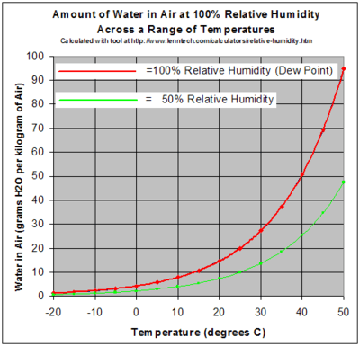 For example, if the air temperature is 24 °C (75 °F) and the relative humidity is zero percent, then the air temperature feels like 21 °C (69 °F).[5] If the relative humidity is 100 percent at the same air temperature, then it feels like 27 °C (80 °F).[5] In other words, if the air is 24 °C (75 °F) and contains saturated water vapor, then the human body cools itself at the same rate as it would if it were 27 °C (80 °F) and dry.[5] The heat index and the humidex are indices that reflect the combined effect of temperature and humidity on the cooling effect of the atmosphere on the human body.