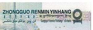 The denomination of each banknote is printed in Chinese. The numbers themselves are printed in financial Chinese numeral characters, as well as Arabic numerals. The denomination and the words "People's Bank of China" are also printed in Mongolian, Tibetan, Uyghur and Zhuang on the back of each banknote, in addition to the boldface Hanyu Pinyin "Zhongguo Renmin Yinhang" (without tones). The right front of the note has a tactile representation of the denomination in Chinese Braille starting from the fourth series. See corresponding section for detailed information.