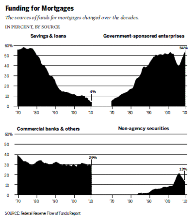 - ↑ "an incredible 77 percent of the mortgages being made in America are guaranteed by Fannie and Freddie", The End of Fannie and Freddie?| By JOE NOCERA| nytimes.com| June 26, 2013