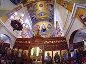 Inside, the modest white interior is dominated by a huge carved wooden iconostasis.[3]
