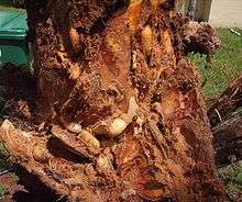 The palmetto weevil (Rhynchophorus cruentatus) is an insect native to Florida, but has been found as far as southern Texas to the west and South Carolina to the north.[1][2] It is the largest weevil in North America and the only kind of palm weevil in the continental United States.[1] It infests palms and is considered a pest.[1][3][4] Its main target is the Canary Island date palm, but date palms (a different species than the Canary Island date palm), sabal palms (the palmetto weevil's traditional target), saw palmetto (the palmetto weevil's traditional alternative target), Washingtonia, Pritchardia, royal palms, Latania, coconut palms, Caryota, and Bismarckia are also susceptible.[1][2][3][5] Distressed palm trees are usually attacked, which makes transplanted trees a frequent target.[3] The Palmetto Weevils mate at the base of the palm branches where the females deposit their eggs.[3] The grubs then eat into the palm tree, killing it.[3] After the larvae have turned into adult weevils, the damage can be seen, but by then, it is considered to be too late for the tree.[1][3] The life cycle from egg to adult for a palmetto weevil is about 84 days.[6] For prevention, it is recommended an appropriate insecticidal crown drench is done twice a year for high value palms.[3]