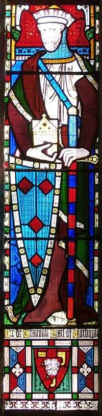 An imaginary depiction of Richard I de Grenville (d. post 1142) and his elder brother Robert FitzHamon (d.1107)[31]) is contained within one of the two Granville windows by Clayton and Bell[32] erected in 1860 by supposed descendants of the former within the Granville Chapel of the Church of St James the Great, Kilkhampton, Cornwall. The seat of the Grenville family ("Granville" after 1661 when elevated to the Earldom of Bath[33]) was Stowe within the parish of Kilkhampton. Below the left-hand figure is inscribed: "Rob. FitzHamon Earl of Corboyle", with attributed arms under showing: Azure, a lion rampant guardant or impaling Azure, a lion rampant or a bordure of the last. The right hand figure is of Richard de Granville, the younger brother of Robert FitzHamon and one of the Twelve Knights of Glamorgan who followed his brother in effecting the conquest of Glamorgan. He holds in his hands the church of his foundation of Neath Abbey, Glamorgan. Below is inscribed: "Ric. de Granville Earl of Corboyle" with attributed arms under showing: Gules, three clarions or (the arms of the Grenvilles' later overlord and Robert FitzHamon's heir in the feudal barony of Gloucester,[34] Richard de Clare, Earl of Gloucester, which arms were later adopted by the Grenvilles[35]) with an inescutcheon of pretence of Gules, three lions passant argent. The Granvilles claimed in the 17th century to have been the heirs male of Robert FitzHamon (who left only a daughter as his sole heiress) in his supposed Earldom of Corboil.[36] The windows were erected in 1860 by the heirs of the Grenville family: George Granville Sutherland-Leveson-Gower, 2nd Duke of Sutherland KG (1786-1861); John Alexander Thynne, 4th Marquess of Bath (1831–1896); George Granville Francis Egerton, 2nd Earl of Ellesmere (1823–1862); Lord John Thynne (1798-1881), DD, Canon of Westminster, a younger son of Thomas Thynne, 2nd Marquess of Bath (1765-1837), KG.[37]