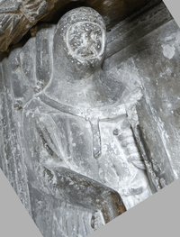 Sir Richard was also buried in Exeter Cathedral, near his brother the bishop, against the north wall across the north ambulatory from the bishop's tomb. His tomb is marked by an elaborate monument comprising a recessed ogee shaped niche set into the wall, containing his recumbent effigy, in the form of a cross-legged knight, which style supposedly represents crusaders. At the effigy's head stands a small statue of a man and at the feet a horse with an even smaller statue of a man holding its reins. According to Prince (d. 1723)[18] this last group refers to the tradition of the cripple who seised the foreleg of Sir Richard's horse at Cripplegate and thereby threw him off his horse into the hands of the murderous mob. It is however more likely that the figures are "a touching early fourteenth century visual representation of the Knight with his immediate following ... a knight is shown accompanied by his squire, page and horse".[19] The Devon historian Sir William Pole (d. 1635) stated that the arms of Stapledon (Argent, two bends wavy sable) were displayed on the shield of the effigy,[20] but today no trace of colour remains. These arms are however still visible (possibly restored) on the nearby monument to his brother the bishop.