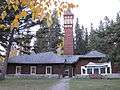 The forest reserve was set aside as a national park in 1929, officially declared Riding Mountain National Park on May 30, 1933.[3][6] The park opened to visitors on July 26 of that year, with Manitoba Lieutenant-Governor James D. McGregor unveiling a cairn and giving a speech at a dedication ceremony.[6] In attendance were Manitoba Premier John Bracken, Minister of Natural Resources J. S. McDiarmid, and Thomas G. Murphy, Minister of the Interior.[7] According to the Winnipeg Evening Tribune, over one thousand vehicles were registered at various park entrances and over four thousand people had been admitted inside the park forty-five minutes after McGregor arrived.[7] Ten thousand people in total attended the ceremony, where the Clear Lake site was designated Wasagaming.[7][8] Much of the public infrastructure in Riding Mountain National Park was created during the 1930s by labourers participating in Canada's great depression relief programs. In total there were ten relief camps supervised by James Wardle.[5] Funding for these relief programs was provided by the 1930 Unemployment Relief Act and the 1934 Public Works Construction Act. In 1932 most relief workers were British and over half were from Winnipeg.[5] At this time the one-and-a-half storey interpretive center and several other buildings were built of log, many featuring a rustic architectural style.[9] A lot of this early construction survives to this day.