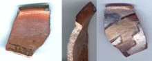 On some Glaze A pottery, the interior slip color differs from the exterior slip color (so that the background colors are different on each side of a potsherd). If the painted design was executed with black glaze paint, the type is known as San Clemente Glaze Polychrome. If the design also includes red matte paint elements (usually outlined in black), the type is known as Pottery Mound Polychrome (Wilson 2005:51–52).