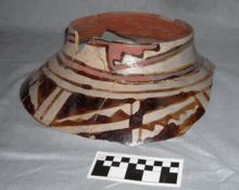 Late in the sequence, a variant appears in which black paint designs appear over contrasting interior and exterior slips, with Glaze F rims. This combination is called Kotyiti Glaze Polychrome, however, the same name is used for F rim examples with red-and-black painted designs (see below).