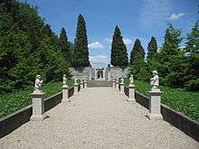 Allerton Park's gardens consist of a 1/4-mile-long (0.4 km) formal garden, and a 1 1⁄4-mile-long (2 km) sculpture walk extending westward from the end of the formal garden. The gardens incorporate many pieces of sculpture and ornaments.[12]