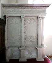 His large monument, with strapwork decoration, survives against the south wall of the chancel of All Saints Church, Clovelly. Along the full length of the cornice is inscribed in gilt capitals: Robertus Carius, Armiger, obiit An(no) Do(mini) 1586[14] ("Robert Cary, Esquire, died in the year of Our Lord 1586"). On the base of the north side are shown two relief sculpted heraldic escutcheons, showing Cary impaling Chequy argent and sable, a fess vairy argent and gules[15] (Fulkeram, for his father) and Cary impaling Sable, three swords pilewise points in base proper pomels and hilts or (Poulett, for his grandfather). On the base of the west side is a similar escutcheon showing his own arms of Cary (of four quarters, 1st: Cary; 2nd: Or, three piles in point azure (Bryan);[16] 3rd: Gules, a fess between three crescents argent (Holleway);[17] 4th: A chevron (unknown, possibly Hankford: Sable, a chevron barry nebuly argent and gules[18]) impaling Gules, a chevron or between three millets hauriant argent (Milliton, canting arms, a "millet" in heraldry being a type of fish, possibly a mullet)[19])