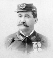 He was with Company B at the Murfreesboro, Tennessee courthouse when it was attacked by a Confederate cavalry brigade under command of Brigadier General Nathan Bedford Forrest on July 13, 1862, at the First Battle of Murfreesboro. Hendershot was captured with the rest of his regiment and paroled with the enlisted men. Shortly thereafter he was discharged for disability; he suffered frequent and severe epileptic seizures, an affliction he had endured since early childhood.[14][15][16][12][5][17][18][19] Although this alone should have precluded any further military service, "an oath of honor" also obliged Hendershot "not to take up arms against the Confederacy until regularly exchanged."[20][21] In spite of this, in early September Hendershot appeared at a Detroit recruiting office and enlisted in the Eighth Michigan Infantry. Because of his parole, he signed on with an alias, "Robert Henry Henderson." His critics later called this despicable, while others said it had been a common practice.[22][23][24][lower-alpha 1] Hendershot claimed he had done so at the urging of the recruiter, Lieutenant Michael Hogan,[25] retained him as his personal servant and aide for the next two months. When Chaplain George Taylor arrived from Ann Arbor, he developed a fondness for Hendershot and gained permission to have him placed under his "special care."[26]
