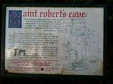 He lived in various places in the vicinity of Knaresborough before taking up residence in a cave by the river Nidd (then known as St. Giles' Priory). It is said that King John visited him and Trinitarian friars also venerated him[5] Towards the end of his life, pilgrims flocked to see Robert to seek spiritual guidance and to be healed of physical ailments.[6] His brother Walter, then Mayor of York, came and paid for some new buildings, including a chapel dedicated to the Holy Cross. The floor plan of this can still be seen alongside Robert’s cave in Knaresborough today.[3] St. Robert's Cave is situated between Abbey Road and the River Nidd (53.999421, -1.451212). There is a path from the road down to the cave and ruins of the chapel. A sign shows the site layout and a brief history.