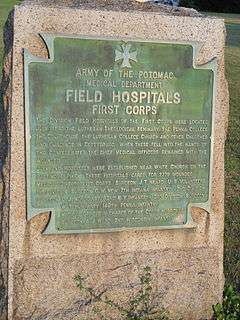 Rock Creek-White Run Union Hospital Complex is a national historic district located at Cumberland Township, Gettysburg, and Mount Joy Township in Adams County, Pennsylvania. The district includes 11 contributing buildings and 13 contributing sites, on 13 contiguous properties including 8 farmsteads and White's Church (or Marks German Reformed Church). The farmsteads are Schwartz Farm, Shaeffer Farm, Trostle Farm, Lewis Bushman Farm, Diener Farm, Conover Farm, Lightmer Farm, and Beitler Farm. The properties served as hospitals for the 1st, 2nd, 3rd, 5th, 6th, and 12th corps of the Army of the Potomac during the weeks immediately following the Battle of Gettysburg.[2]