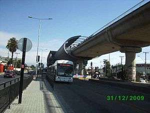 Rojas Magallanes is an elevated metro station on the Line 4 of the Santiago Metro, in Santiago, Chile. The station has two side platforms and two tracks on a precast concrete segmental viaduct[2] with single central columns. It is enclosed in a tubular structure with elliptical cross section, from which protrude two balcony-like structures containing stairs that lead to the mezzanine level.