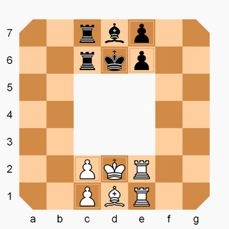 The board comprises 7×7 squares with the central 3×3 section missing. Pieces generally move clockwise around the board. Each player starts with one king, one bishop, two rooks, and two pawns.