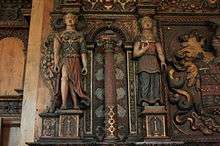 The chimneypiece of the Rotherwas Room is of oak, a material widely used in English household construction.[29] Its woodwork is a product of the union of artisanal tradition of the English countryside and an interest in architectural ornamentation arriving from Renaissance Italy.[30] The incorporation of Italian decorative elements into the stylistic vocabulary of English builders was not exceptional at this time.[7] From 1560 to 1610 Italian designs arrived from northern European countries, particularly the Netherlands, in the form of engraving pattern books.[31] These include Sebastiano Serlio's The Five Books of Architecture and Wendel Dietterlin's Architectvra: Von Außtheilung, Symmetria vnd Proportion der Fünff Seulen, as well as treatises such as Vries's "Perspective" and Rivius' "Oder Architectur aller Furnensten Baukunst". The illustrations within these books lacked precision in both form and scale, leaving the craftsman to interpret information according to local tradition and personal expertise.[32] This phenomenon explains the Italian influence on the English style of woodwork that dominates the mantelpiece. The most frequently occurring decorative elements are found in the wainscoting of the Rotherwas Room.[7] Although the identities of the craftsmen are unknown, the figural carvings on the mantel bear similarity to contemporary works by the Huguenot sculptor Maximilian Colt at Robert Cecil, First Earl of Salisbury's Hatfield House, which dates from the same period.