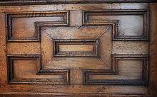 The paneling of the Rotherwas Room is made of walnut, a highly valued imported wood most likely imported from Germany or the Netherlands.[34] While oak was widely used in construction in the Rotherwas estate due to its abundance on the five thousand acre property, large walnut trees did not exist in England prior to 1650 and were rarely used in English paneling if at all.[7] The wainscoting design of lower inner-framed tiers and upper-arcaded panels divided by pilasters and capitals is extremely similar to that of Billesley Manor, Warwichshire and Carbrook Hall, near Sheffield.[35] According to Charles Bodenham, the two doors cut out of the paneling were added in 1611 and 1732 respectively.[36]