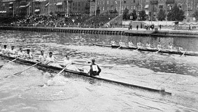 Semifinal 2: 12 noon At the very start, Leander managed to get a couple of metres' lead, but the German crew soon recovered itself, and at the 500 metres mark was leading by about half a length. As seen from the shore, the English eight seemed to take the race very quietly, rowing scarcely more than 34 to their opponents' 38, and at the 1,000 metres mark the Germans were leading by nearly a length. Just before reaching the boat-house, Leander, which had the outside curve, spurted and managed to pick up about half a length, while the Germans, committed the fault of not making use of the advantage given by the possession of the inner curve, and making an extra exertion which have certainly increased the distance between them and the English crew, or, in any case, would have kept them at their previous distance in the rear. Philip Fleming put his men to a severe test from the bath-house to the bridge, and the determination and speed by means of which Leander drew level with their opponents after one minute's rapid spurt, were simply unique. The German crew was not rowed out, however, and a desperate struggle took place all the way from the bridge to the finish, the result being that Leander won by about half a length. Once more a British boat won with excellent tactics.