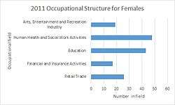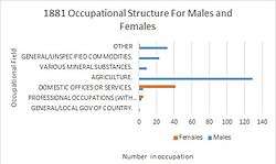 From looking at the following occupational structure graphs, there has been a clear change in fields of employment since 1881. In 1881 agriculture was the dominant field of occupation whereas in 2011, most of the residents, approximately 16%, worked in professional occupations. You can see a clear change in the occupational structure for men who have shifted from Agricultural occupations to occupations involved in Construction. Nowadays, few women work in the Domestic Offices or Services, whilst the majority of women work in Social Services such as in Human Health or Education. This changing pattern of occupation fits in with the overall national trends, where 12% of the those in England and Wales work in Skilled Trades Occupations.[10]