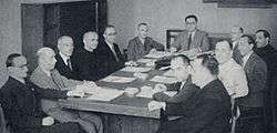 Photo from a session of 1942. From left to right: Vangjel Koca, Aleksander Xhuvani, Anton Paluca, Anton Harapi, Xhevat Korça, Mustafa Kruja, Ernest Koliqi, Dhimiter Beratti, Giuseppe Valentini, Karl Gurakuqi, Ekrem Vlora, Nicola Lo Russo Attoma, Dom Lazer Shantoja. | |