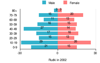 According to the 2002 Poland census, there were 289 people residing in Rudki village, of whom 53.3% were male and 46.7% were female. In the village, the population was spread out with 26% under the age of 18, 35.3% from 18 to 44, 19% from 45 to 64, and 19.7% who were 65 years of age or older.[1]