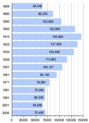 In 1869, the current area covered by the Rudolfsheim-Fünfhaus district already included 64,042 inhabitants, and it was similarly densely populated as it is today. Through the continuous influx of people into the area, the population increased until the beginning of World War I, and had doubled by 1910 at the peak of 145,694 people. Afterwards, a permanent population decline occurred, which was mainly due to higher housing claims. After a historic low of 64,895 inhabitants in 2001, the district population trended to re-grow. Only after the turn of the millennium, did the population in Vienna city-wide tend to grow. At the beginning of 2007, the population stood at 70,490 people in Rudolfsheim-Fünfhaus.