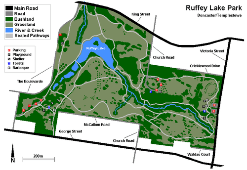 The park has three toilet blocks and electric barbecues are distributed throughout. There are three playgrounds in Ruffey Lake Park; near the Boulevard and Victoria St entrances. In the last 10 years facilities have been upgraded, predominantly the playgrounds, especially the Victoria Street adventure playground. There are sealed pathways giving access to almost every area of the park. These are of standard width and in relatively good condition but do not host dividing lines. The north-west area of the park has fewer facilities.[2]
