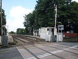 The level crossing runs across the B5246, the aptly named "Station Road". This is supervised from the nearby signal box, which also controls the only passing loop on the otherwise single track branch line.