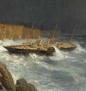 The Livadia left Greenock on October 3 with Popov, Tideman, Edward James Reed and William Houston Stewart on board.[26] She safely reached Brest on October 7, where she picked up General Admiral of the Imperial Navy Grand Duke Constantine.[26] On October 8 the Livadia sailed into the Bay of Biscay and was soon caught in a violent storm.[26] According to Reed, sailing straight into the storm to test the ship was Constantine's idea and that no Russian dared to argue.[27] Waves of six to seven meters failed to upset the Livadia: transverse roll did not exceed 3.5 degrees, longitudinal pitch was within 5.5 degrees.[27] Stewart praised the comfort of the Livadia: "I never was in so comfortable a ship at sea in a gale of wind ... the absence of rolling, the easiness of motion, the great comfort on board, and the handiness of steering, were such as I have never seen before in any other ship under similar circumstances of weather and sea".[5]