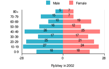 Figure 1. Population pyramid of village in 2002 — by age group and sex[1]