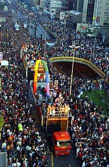 São Paulo LGBT Pride Parade (Portuguese: Parada do Orgulho LGBT de São Paulo) is an annual gay pride parade that happens in Avenida Paulista, in the city of São Paulo, Brazil, since 1997. In the year of 2006, it was considered the biggest pride parade of the world by the Guinness Book of World Records. In 2010, the city hall of São Paulo invested R$ 1 million reais in the parade. The event is the second largest of the city, after only Formula One.[1] According to the LGBT app Grindr, the gay parade of the city was elected the best of the world.[2]