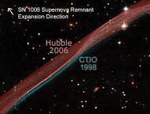 - ↑ Winkler, P. Frank; Gupta, Gaurav; Long, Knox S. (2003). "The SN 1006 Remnant: Optical Proper Motions, Deep Imaging, Distance, and Brightness at Maximum". The Astrophysical Journal. 585 (1): 324–335. arXiv:astro-ph/0208415