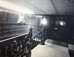 Situated on the promenade deck was a tea room which was paneled in grey sycamore and mahogany.[4] Below this there was the Lady's Saloon, which was finished in satin wood and walnut. The smoke room with adjacent bar was situated in the after part of the deck-house on the shelter deck.[4] On the main deck there was the main saloon, which was 80 feet (24 m) long and 46 feet (14 m) wide. It was lit by large patent rectangular windows which were paneled with mahogany with carved pilasters.[4] The first class dining saloon was situated on the lower deck with accommodation for 120 passengers.[4] It also had a handsome appearance, being paneled in mahogany and oak. At the aft end of the dining saloon there was a large pantry fitted up with Bain Maries, carving tables and linked by lifts to the main galley, which was situated above.[4] At the fore end of the dining saloon on the lower deck there was a saloon for first class passengers.[4]