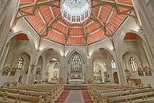 The nave arcades are supported by clustered marble piers with foliated tops and moulded lancet arches.[2][3] There is a two-bay gallery to the west.[2] The chancel is flanked by two lady chapels. The church fittings include a white marble octagonal pulpit that is carved and sits on red and black columns.[3]
