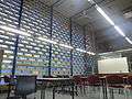 The large cream-coloured façade acts as the solid feature to the flow to the Warrigal Rd traffic, which also blends into the fabric of the adjacent brick domestic housing. A pattern of rectangular opaque coloured glazing (which alludes to medieval precedent) is embedded into the brick façade which act as soft light walls for the interior classrooms, which help complement the solid steel structure exposed on both exterior and interior. Above the wall are timber slats which line the under-side of the ceiling on the exterior. The steel structures are notably evident primarily in the courtyard; pilotis which support sections of the first level thus allowing more space and movement below. These columns create a sense of internal colonnade within the space. The square plan provides many spatial and environmental qualities to the building; a 360° view of adjacent classrooms, a divide between the noise of the constant traffic on Warrigal Rd and the students within in attempt to establish quietness and seclusion, and allowing sun and air to enter through the void which circulates into the classrooms. The two rows of small rectangular windows on the first floor also allow for such circulation, which are precedent of early Renaissance Florentine palazzo, a building form that Romberg admired. The square plan not only echoes in the fenestration, but also in the checked pattern on the courtyard pavement. The initial design of five classrooms in the building was allocated at the first floor (which was to accommodate for only 150 students).[1]