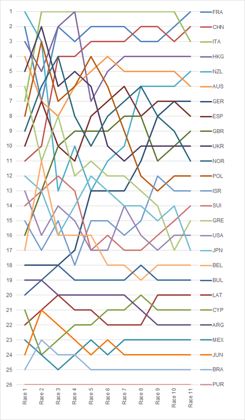 Graph showing the daily standings in the Women's Mistral One Design during the 2004 Summer Olympics
