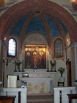 After the suppression of the monastic orders by Napoleon Bonaparte, the farmhouse and church were sold to various landowners.[15] In 1886 the church was restored and some frescoes of the fourteenth century were found. They depict Saint Ambrose among his brothers Satyr and Marcellina with the holy martyrs Sebastian and Pope Fabian.[16]