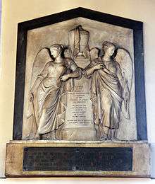 He died of paralysis on 24 July 1844, aged 70. His memorial in St Mary Magdalene, Richmond church is a tablet with two marble full length angels, by Edward Hodges Baily R.A., who was famous for sculpting Nelson on Nelson's column.[3]