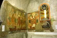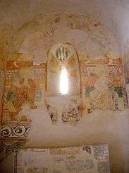 The hermitage housed many fine Romanesque frescoes from about 1125; most of these have been removed, but some have remained. Two sections, transferred to canvas, are now in the Indianapolis Museum of Art, showing the Entry of Christ into Jerusalem and the Wedding at Cana.[6] Other sections, including the The Healing of the Blind Man and the Raising of Lazarus and The Temptation of Christ are in the Metropolitan Museum of Art in New York,[7] and in the Prado. The paintings were done by the Catalan Master of Tahull (Taüll in Catalan), whose best known works are in Sant Climent de Taüll and the Museu Nacional d'Art de Catalunya in Barcelona,[8] with two other painters. The scenes of the Life of Christ are unusual in Spanish painting at this period; these are in American museums, while smaller elements including scenes of hunting and falconry and decorative copies of textiles are in Madrid as well as New York.[9] The frescoes include that of a camel and of a war elephant, which were inspired by Muslim motifs.[1]