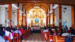 The first church was said to be ugly so when it was partially damaged during a very strong typhoon in 1872,[4] then Vicar Fr. Crescencio Polo saw to the reconstruction of a stronger and more artistic structure in 1873,[3] covering the roof with cogon.[4][2] Fr. Polo also remodeled the convent made of stone and mortar, which is attached to the church.