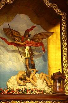 Located at the foot of the image of Saint Michael on the main retablo is a relic of the Apparition of Saint Michael in Italy. Recalling the history of the said apparition, a herdsman named Gargan was pasturing his heard in the area when a bull wandered off into the mountains and went inside a cave. After locating the cave where the bull sought refuge, a man shot an arrow inside the cave but mysteriously bounced back and shot the one who released the arrow. With the puzzling event, the people sought the help of the local bishop. It is said the Saint Michael presented himself to the bishop and ordered the cave to be consecrated under his name.[4][5][6] It is now known as the Sanctuary of Monte Sant'Angelo. Relics associated with the said apparition, such as that found inside this church, may have been rocks chipped off from the cave or pieces of cloth that has touched it.[4]