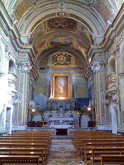 The stucco and white marble interior is mainly the design Domenico Antonio Vaccaro following a reconstruction in the 18th century. The main altar is attributed to Granucci. In the lateral chapels is a St Joseph and Child Jesus with Saints Gennaro and Elmo by Giuseppe Castellano. It is placed next to a 16th-century crucifix. the frescoes on the ceiling (1890) were completed by Vincenzo Galloppi, who also decorated the apse in an oriental style similar to that of Domenico Morelli.