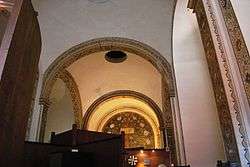 Another feature of the church is its three stained glass window pieces. Two of these were designed by Roberto Montenegro and called "La Vendedora de Pericos" (The Parakeet Seller), and the other is called "El Jarabe Tapatio" (The Jarabe Dance of Guadalajara). The stained glass window with the seal of the University visible on the church's facade was designed by Jorge Enciso.[2] All of these designs were then crafted by Eduardo Villaseñor.[5]