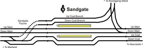 A one kilometre branch diverged behind the station in a north-westerly direction for Sandgate Cemetery. This closed on 13 October 1985.[3][4] Following the completion of the Sandgate Flyover in November 2006, Sandgate station is flanked by two coal lines on either side.[5]