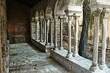 Very little of the original Romanesque architecture remains. The 11th-12th century bell tower, reconstructed later,[1] is the best preserved building. It is a slender tower, 32 metres (105 ft) in height, and rectangular in shape. It consists of five floors with windows in the top four.