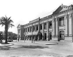 Santa Fe station building and a tram running on Gálvez Boulevard, c. 1940. | |