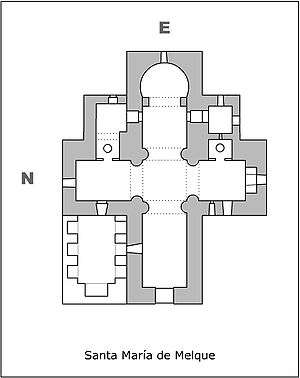 It was constructed in 8th century and it's the first one-half monument better preserved of the Spanish High Middle Ages. Its constructive technique is the architecture's direct inheritance late roman. However, the lack of decorative elements preserved (filigrees of stucco in the transverse arches of the crossing) that still can be seen in the background of the southern arm of the crossing suggests that Melque could be at first a mausoleum, destined to burial of a distinguished personage from Toledo's Visigothic Kingdom. The church was later redesigned on at least two occasions.