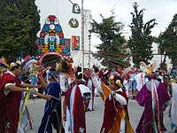 The Contradanza de las Varas is a traditional creole dance that is performed in the town celebrations of this temple, not based on indigenous dances. This is a traditional dance that was danced only men in 25 July in honor of the apostle James since 1652, and that the settlers religious evangelizers taught in the Christian faith in devotion to God. Years later was in honor of the Lord of Chapel. The name of contradanza comes from the use of two rose sticks (rosa gallica) that have colored ribbons with figures that become the rhythm of the dance steps. [9][10]